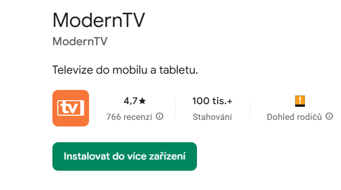 Nejprve potřebujete do mobilu nebo tabletu nainstalovat aplikaci ModerniTV z obchodu Google Play. Otevřete obchod a dejte vyhledat moderni tv.