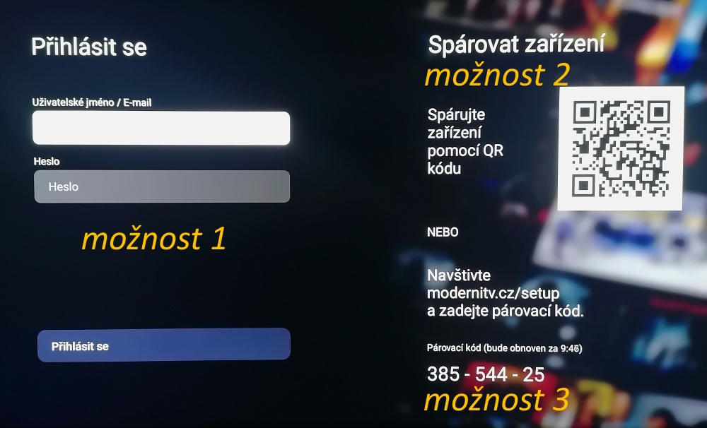 Možnost 2, mobilním telefonem naskenujte QR kod a pak postupujte podle instrukcí, otevřete stránku v prohlížeči nebo v aplikaci ModernTv a pro napárování televize zadejte údaje co jste dostali od nás emailem a dejte Přihlásit se.